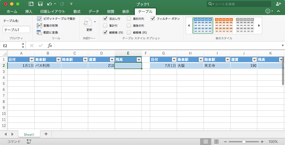 下の図のようにワークシート内に複数のテーブルが存在する場合、左側のテーブルから右側のテーブルに移動するには、左側のテーブルの最終列のセルまで移動したあと、commandキーを押しながら→キーを押します。