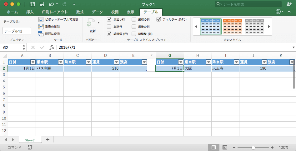 テーブル内でTabキーを押していくと右方向にアクティブセルが移動しますが、その行の最後の列からTabキーを押すと、テーブル内の次の行の最初の列に移動します。テーブル内の最後のセルや最初のセルへの移動、または複数のテーブルが含まれるワークシート内でほかのテーブル内に移動するには、commandキーを押しながら方向キーを押すとOKです。