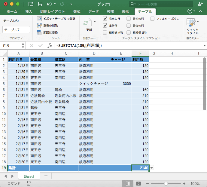 Excel 2016 for Macでテーブルにフィルターボタンが不要な場合、非表示にすることができます。テーブル内にカーソルを移動して[テーブル]タブを開き、[テーブルスタイルオプション]グループから[フィルターボタン]のチェックを外します。