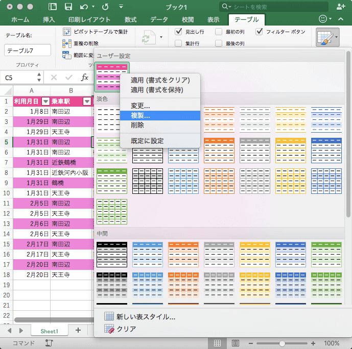 Excel 2016 for Macで既存のテーブルのスタイルの一部を変更したい場合は、基となるスタイルを複製するとよいでしょう。テーブル内にカーソルを移動して[テーブル]タブを開き、[表のスタイル]グループの[クイックスタイル]一覧より複製したいスタイルを右クリックしてショートカットメニューより[複製]をクリックします。