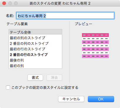 - テーブル スタイルを現在のブックの既定のテーブル スタイルとして使用するには、[このドキュメントの既定の表スタイルに設定する]チェック ボックスをオンにします。