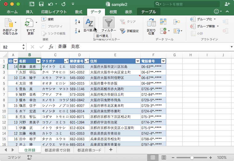 - [データ]タブの[並べ替え/フィルター]グループの[並べ替え]ボタンをクリックします。