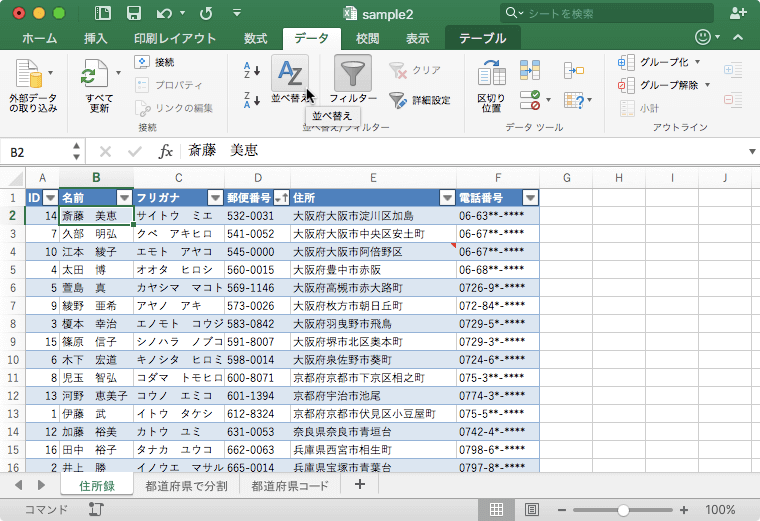 テーブルのフィルターと並べ替え