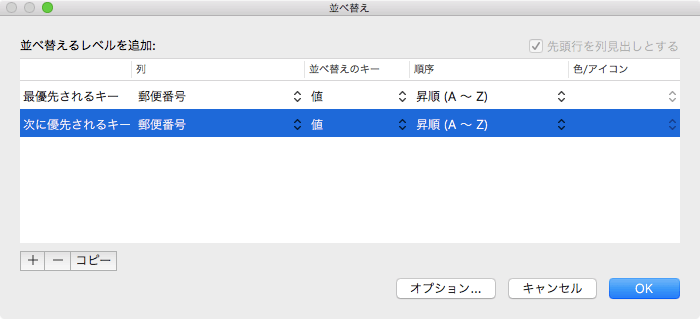 Excel 2016 for Macで[データ]タブの[並べ替え/フィルター]グループの[並べ替え]ボタンをクリックして[並べ替えとフィルター]ダイアログボックスを表示し、コピーしたい条件を選択して[コピー]ボタンをクリックします。