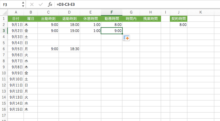 たとえば、数式を下方向にコピーすると、行列固定せず相対的に参照セルがずれます。D2-C2-E2