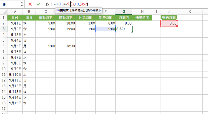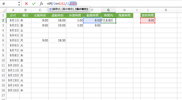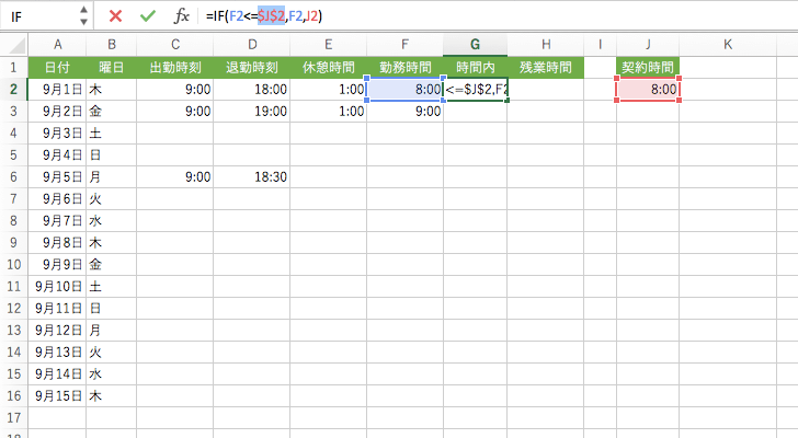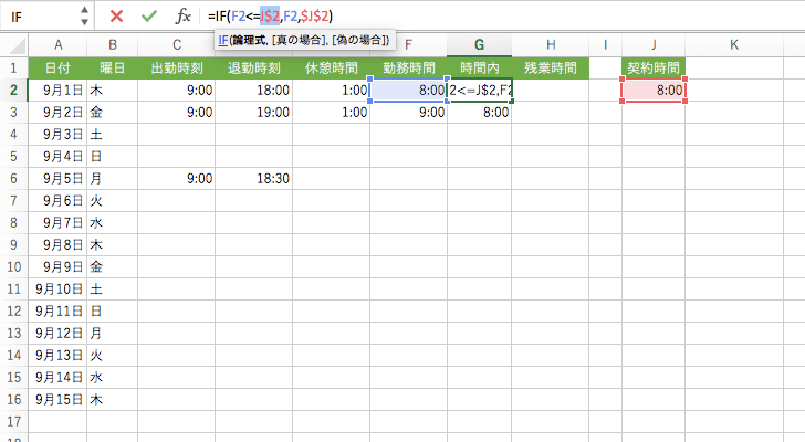 複合参照(行固定)されたセル番号にカーソルを移動してもう一度F4キーを押すと、行番号の前の$が外れ、列番号の前に$がつきます。(J$2