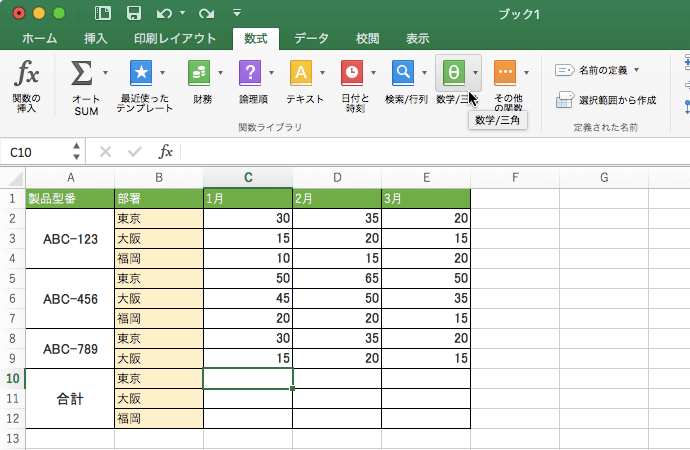 - C10セルを選択して、[数式]タブを開き、[数学/三角]一覧からSUMIFを選択します。