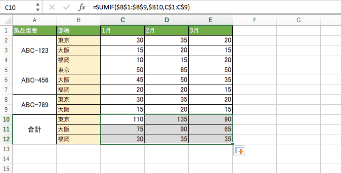 | 1 | 製品型番 | 部署 | 1月 | 2月 | 3月 |