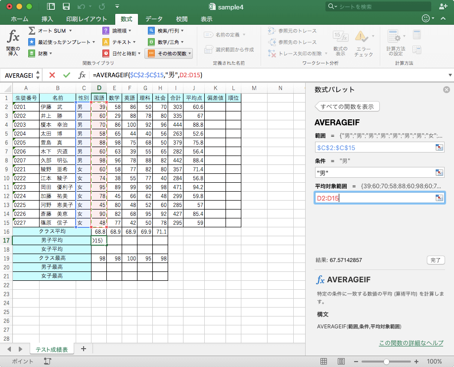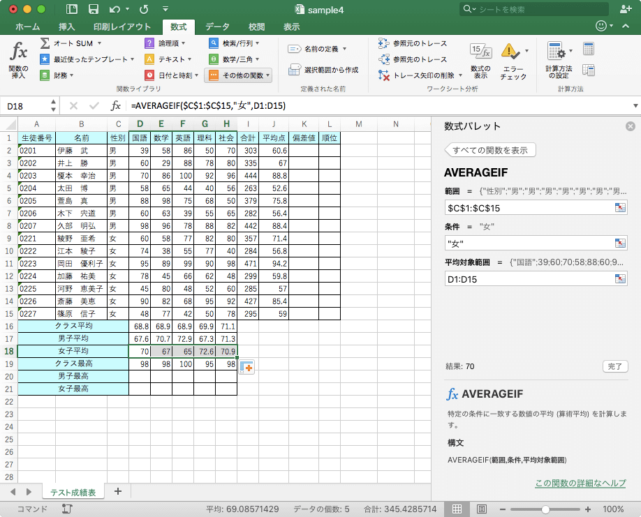 特定の条件に一致する数値の平均(算術平均)を計算するには、統計関数、AVERAGEIFを利用します。Excel 2016 for Macで[数式]タブを開き、[その他の関数]を選択して[統計]をポイントし、[AVERAGEIF]を選択します。[検索条件]の引数は直接値を指定してもOKです。