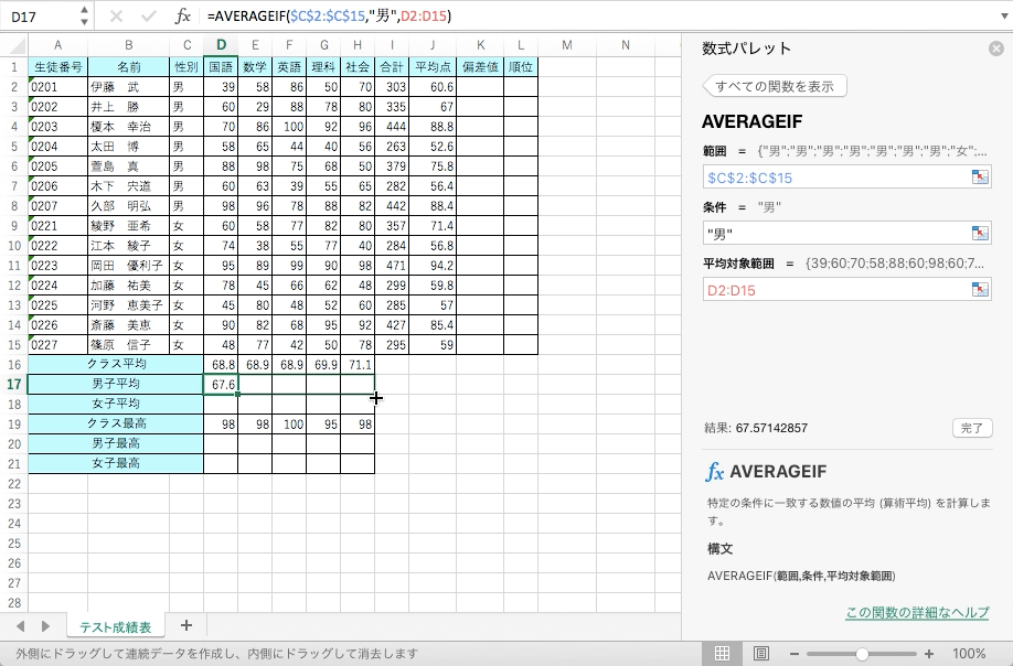 AVERAGEIF(範囲,条件,平均対象範囲)