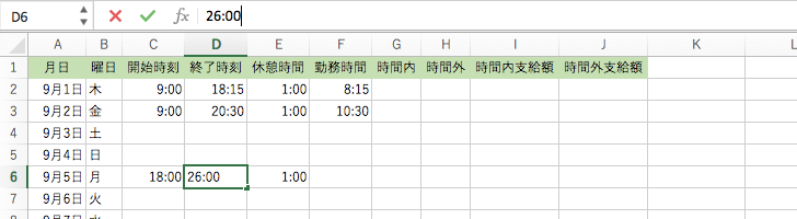 - 勤務時間セルを選択します。