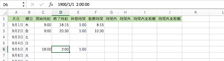 | 1 | 月日 | 曜日 | 開始時刻 | 終了時刻 | 休憩時間 | 勤務時間 | 時間内 | 時間外 | 時間内支給額 | 時間外支給額 |