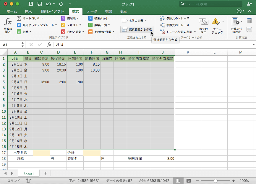 - 列見出しを含めて範囲指定して、[数式]タブの[定義された名前]のなかから[選択範囲から作成]をクリックします。