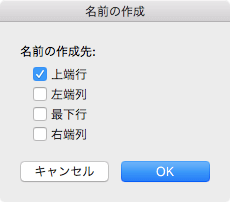 - [選択範囲から名前を作成]ダイアログボックスで[上端行]だけをチェックをつけて[OK]ボタンをクリックします。