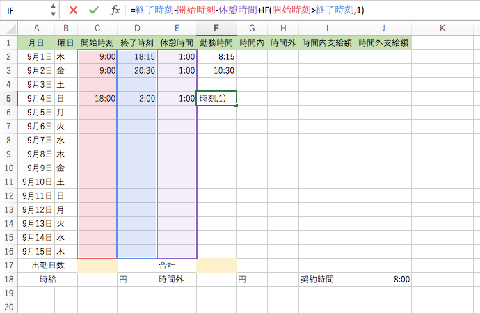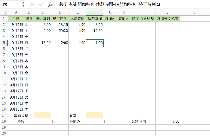 =終了時刻-開始時刻-休憩時間+IF(開始時刻>終了時刻,1)