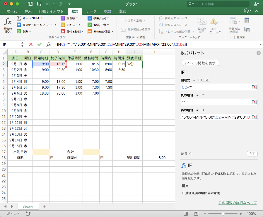 Excel 2016 for Macで 夜勤で深夜勤務時間を求めるには、日をまたぐ場合に24時間加算して計算するほうがシンプルです。ここでは、22時から29時(午前5時)までを深夜時間帯にする方法について説明します。