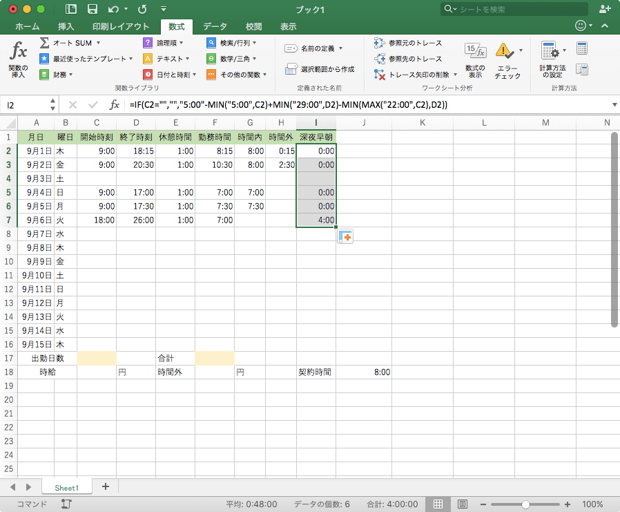 =IF(開始時刻="","","5:00"-MIN("5:00",開始時刻)+MIN("29:00",終了時刻)-MIN(MAX("22:00",開始時刻),終了時刻))
