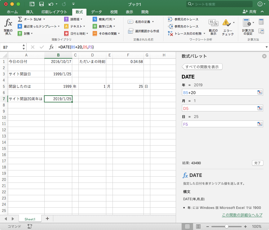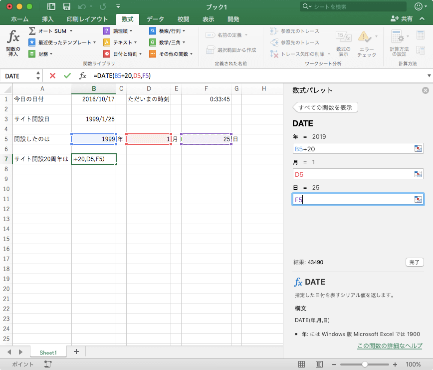 Excel 2016 for Macで指定した日付を表すシリアル値を返すには、DATE関数を利用します。年、月、日の情報が独立している場合等に利用するとよいでしょう。