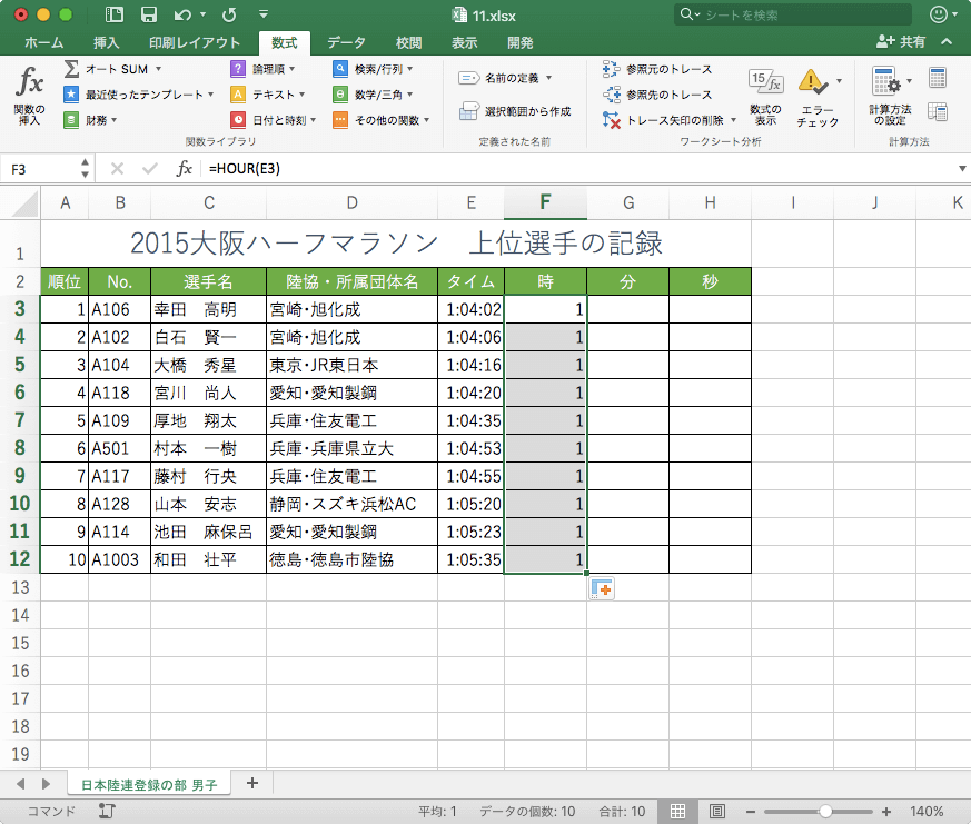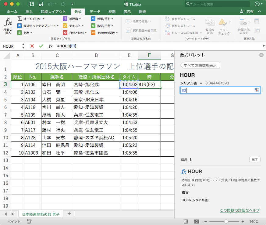 時刻から「時」(0~23までの整数)を求めるには、HOUR関数を利用します。引数として時刻が入力されているセルを指定します。直接時刻を指定するには、ダブルクオーテーションで括る必要があります。Excel 2016 for Macで時を求めたいセルを選択して、[数式]タブの[日付と時刻]をクリックし、[HOUR]を選択します。