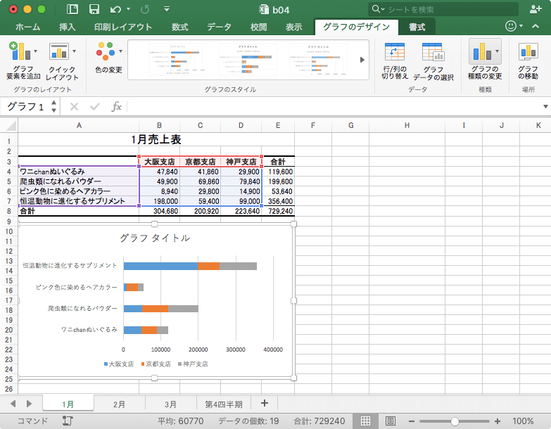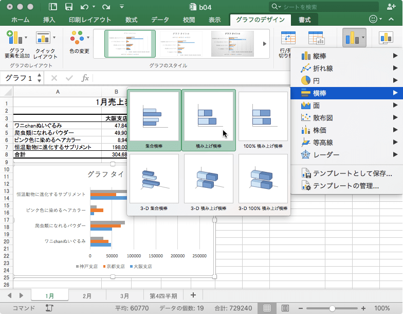 そこで、横棒グラフから積み上げ横棒、または、積み上げ100%横棒にグラフを変更する方法について説明します。