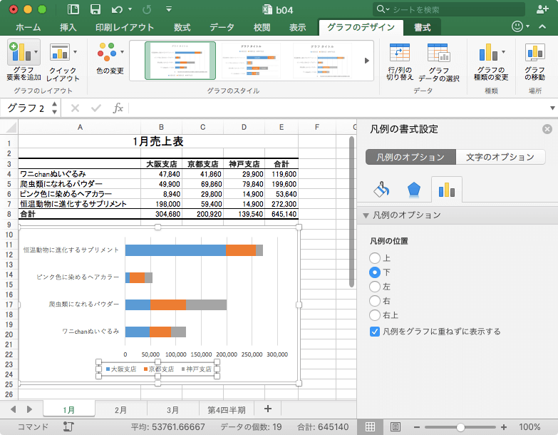 既定ではグラフに凡例が追加されています。Excel 2016 for Macで凡例を追加するには、グラフを選択して[グラフのデザイン]タブを開き、[グラフのレイアウト]の[グラフ要素の追加]一覧より[凡例]をポイントして、凡例の配置場所を指定します。
