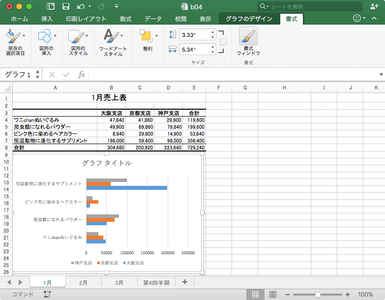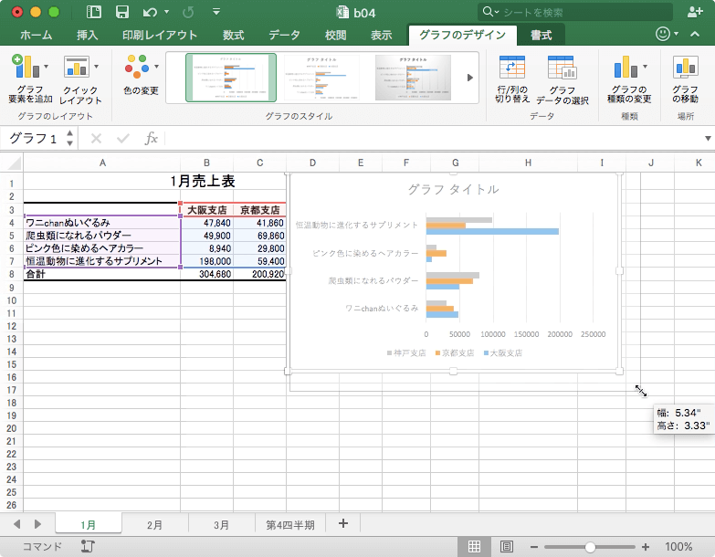 Excel 2016 for Macでグラフを選択すると四隅や四辺にハンドルが表示されます。そのハンドルにマウスカーソルを重ねるとポインターの形が変化するのでドラッグでサイズ調整ができます。なお、[グラフの書式]タブを開き、[サイズ]グループでも数値を指定してグラフのサイズを変更することが可能です。