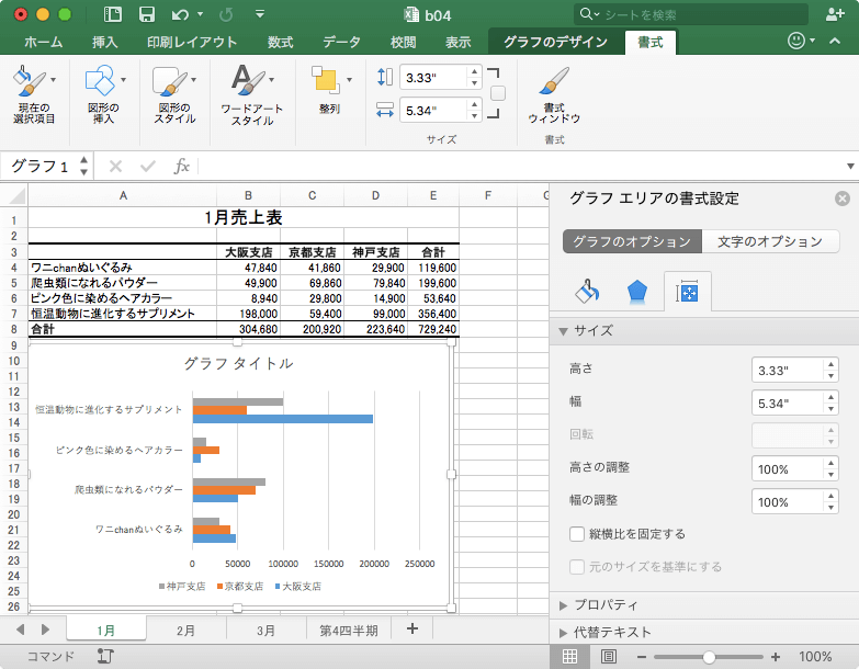 - [グラフエリアの書式設定]作業ウィンドウが表示され、[グラフのオプション]の[サイズとプロパティ]タブでサイズの変更が行えます。