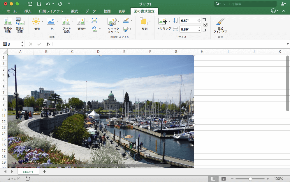 Excel 2016 for Macで[挿入]タブの[写真]ボタンをクリックして、[図をファイルから挿入]を選択し、挿入したい図を指定します。目的の図が入ったフォルダーを開き、そのファイルを選択して挿入先にドラッグ&ドロップで図を挿入することもできます。