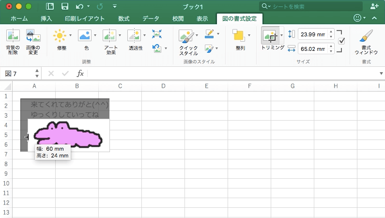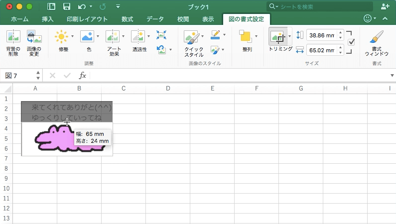 Excel 2016 for Macでトリミングしたい図を選択し、[図の書式設定]タブを開いて、[トリミング]ボタンをクリックすることで、トリミングモードになるので、範囲をドラッグしてもう一度[トリミング]ボタンをクリックします。