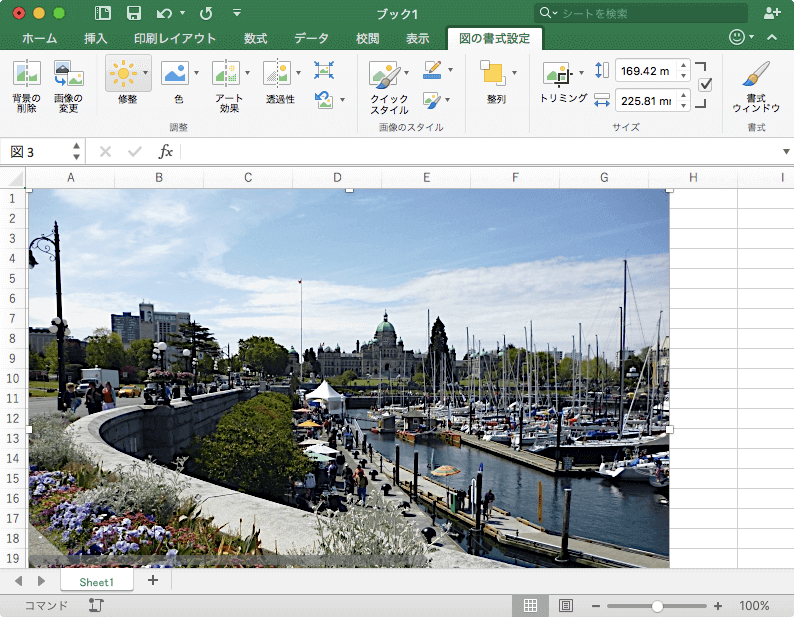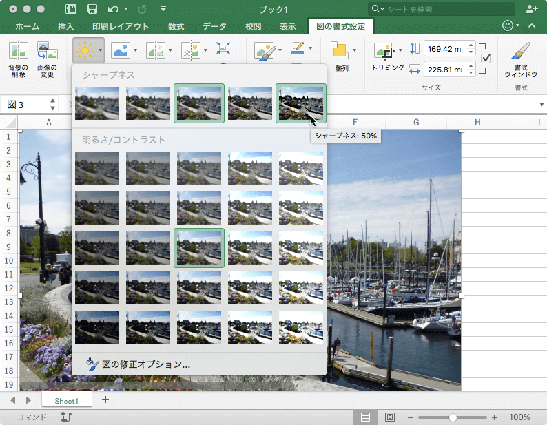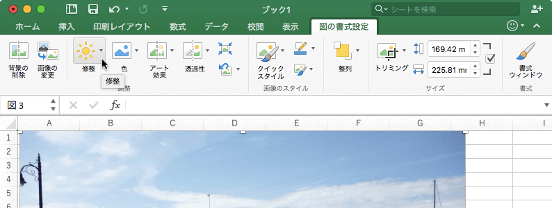 Excel 2016 for Macで挿入した図の明るさやコントラスト、または鮮明度を調整するには、対象となる図を選択して[図の書式設定]タブを開き、[調整]グループの[修整]をクリックして、一覧から選択します。
