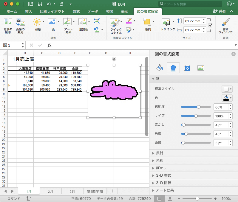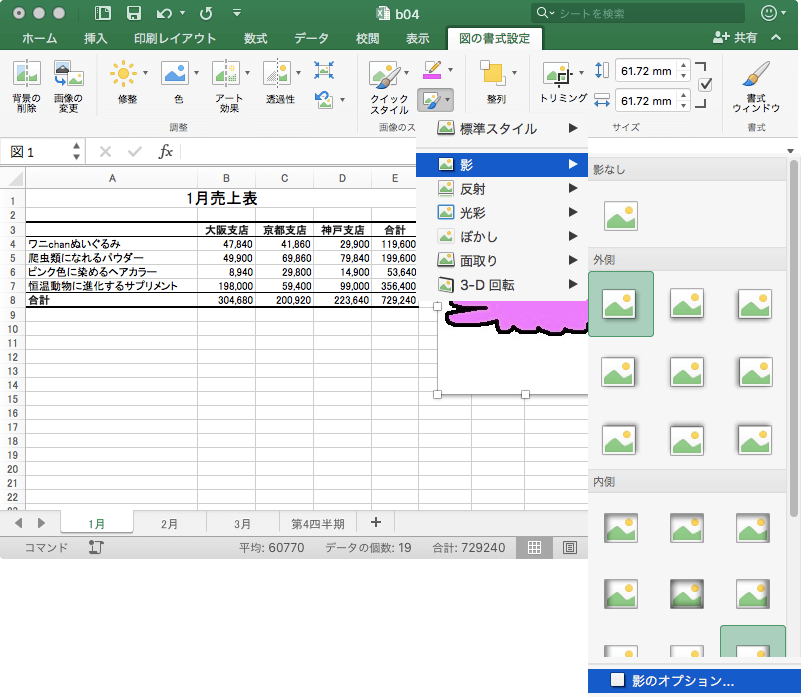 [図の書式設定]タブ、[画像のスタイル]グループの[図の効果]には、影、反射、光彩、面取り、3D回転といった効果を適用できるオプションが備わっています。図のクイックスタイル一覧にはない効果を適用したい時に利用します。ここでは、Excel 2016 for Macで図に影の効果を適用する方法について説明します。