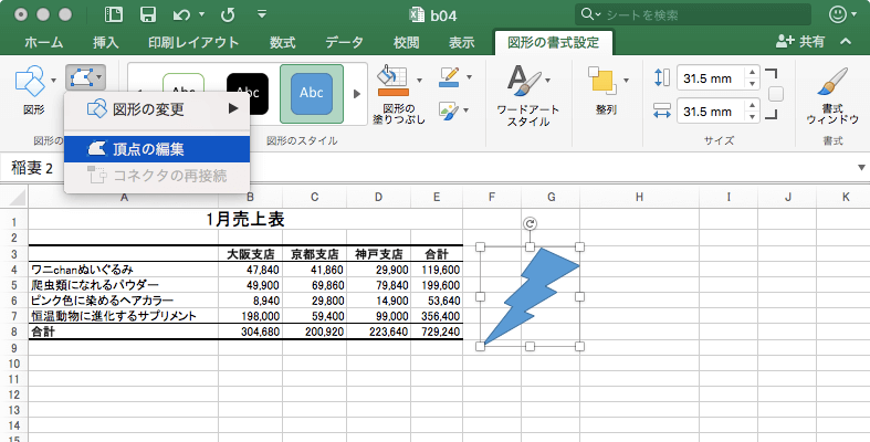 Excel 2016 for Macで自由図形を描画した後、その図形の頂点を編集するには、その図形を選択し、[図形の書式設定]タブの[図形の挿入]グループの[図形の編集]をクリックして、[頂点の編集]を選択し、図形を構成する頂点の 1 つをドラッグします。既定では、頂点を基準にされているので、滑らかな曲線にしたい場合は[頂点を中心にスムージングする]もしくは[頂点で線分を伸ばす]を選択するとよいでしょう。