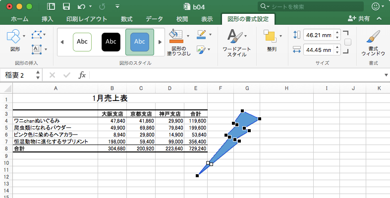 - 図形を選択し、[図形の書式設定]タブを開きます。