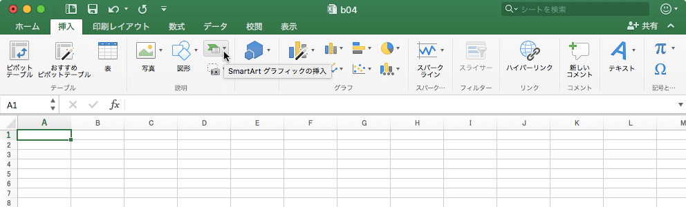 - [挿入]タブを開き、[SmartArtグラフィックの挿入]ボタンをクリックします。