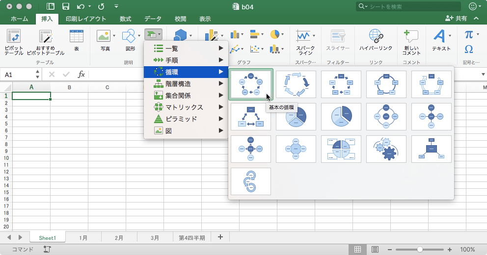 - それぞれのグループからスタイルを選択します。ここでは、[循環]グループをポイントして、[基本の循環]を選択します。