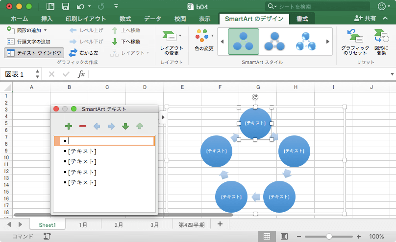 [テキストウィンドウ]が表示されていない場合は、[SmartArtのデザイン]タブの[テキスト