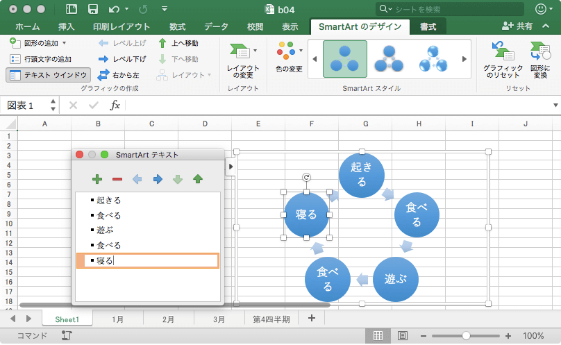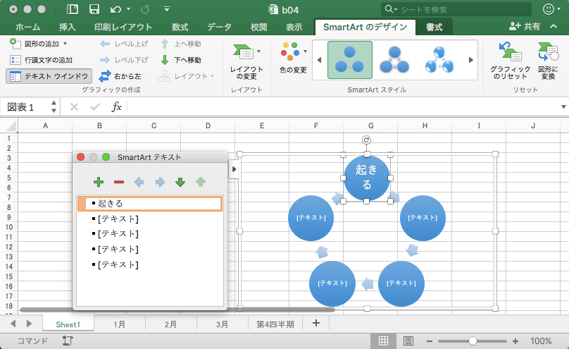 グラフィカルなリストや組織図、手順など、情報を視覚的に表現するには、SmartArtグラフィックを利用します。以前の「図表ギャラリー」がパワーアップしたものです。Excel 2016 for Macで[挿入]タブを開き、[SmartArtグラフィックの挿入]の一覧から選択します。