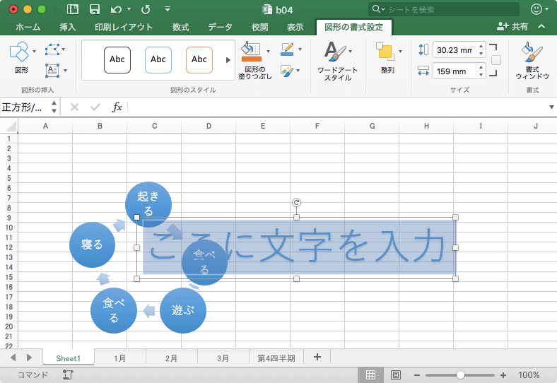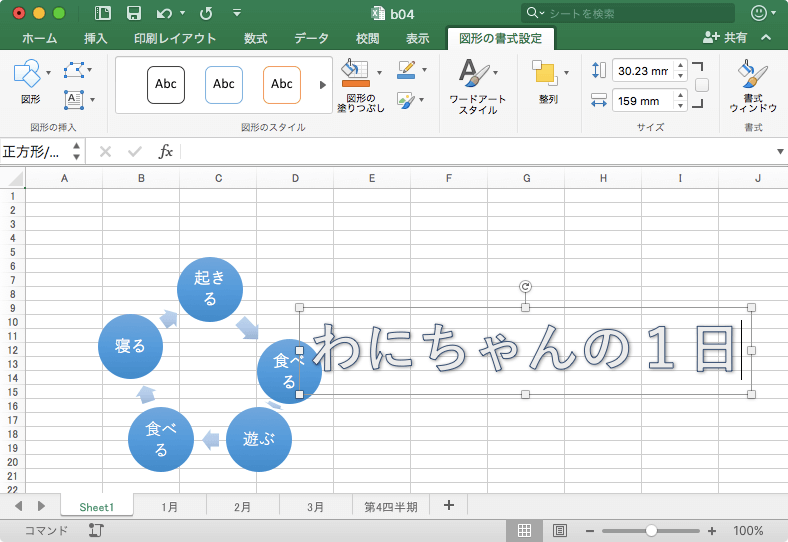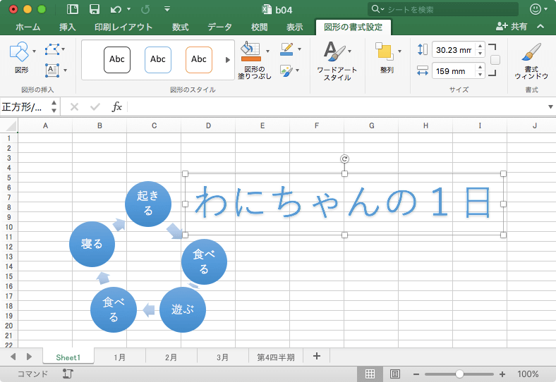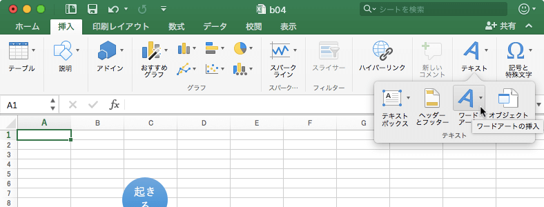 Excel 2016 for Macでタイトルに高いデザイン効果を付けるには、ワードアートを利用します。[挿入]タブを開き、[テキスト]グループの[ワードアート]をクリックして、一覧からワードアートのスタイルを選択し、文字を入力します。 [挿入]メニューの[ワードアート]を選択すると、スタイルが適用されていないワードアートが生成されます。