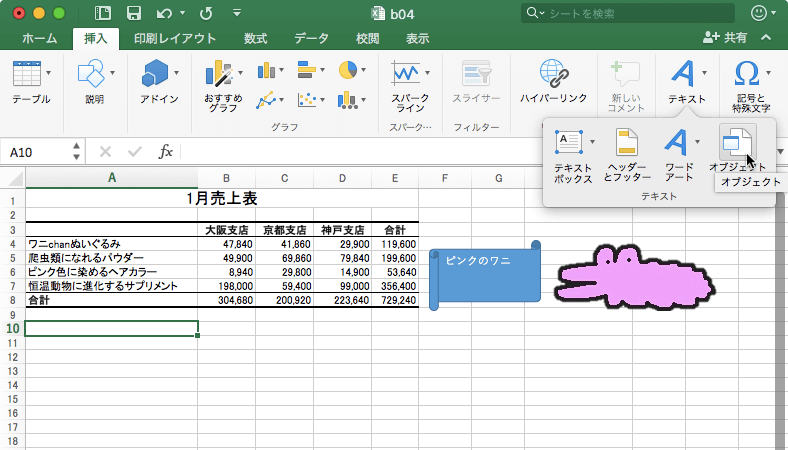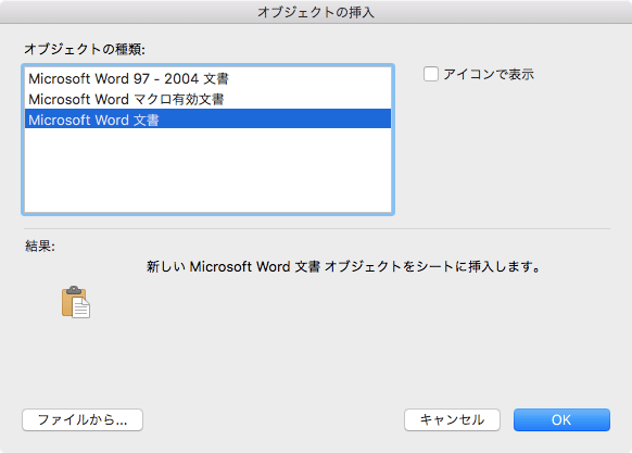 Excel 2016 for Macでワークシート上にWord文書オブジェクトやWordマクロ有効文書オブジェクトを挿入することができます。[挿入]タブを開き、[テキスト]グループの[オブジェクト]をクリックして[オブジェクト]ダイアログボックスより[Microsoft Word 文書]を選択します。