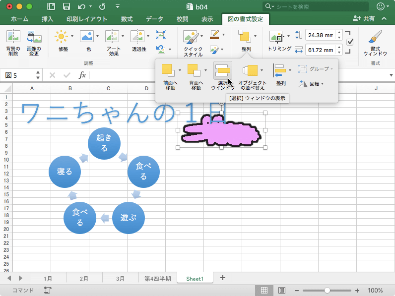 - 図を選択し、[図の書式設定]タブの[整列]グループの[選択ウィンドウの表示]をクリックします。