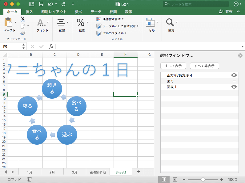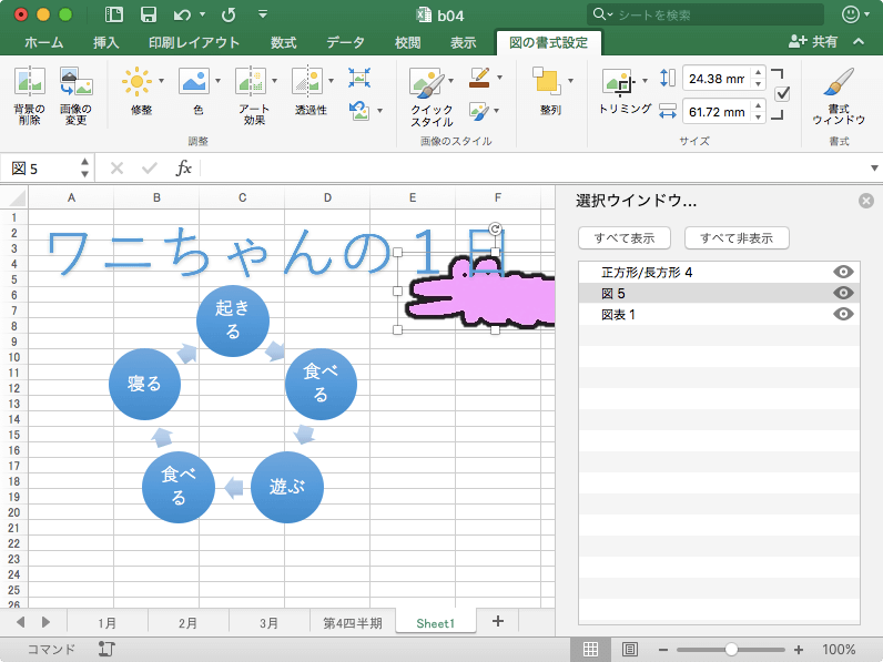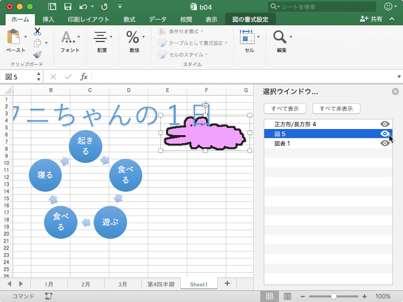 Excel 2016 for Macで選択ウィンドウを使用して、図や図形を非表示にしたり、再表示したりできます。[図の書式設定]または[図形の書式設定]タブの[整列]グループの[選択ウィンドウの表示]をクリックして選択ウィンドウを表示し、対象となる図や図形の目のアイコンをクリックします。その目のアイコンをクリックするごとに表示または非表示に切り替わります。