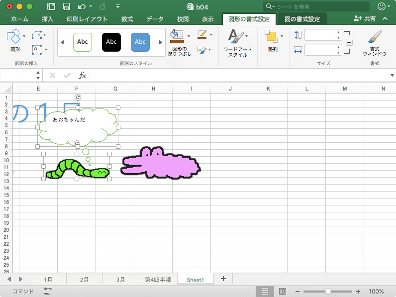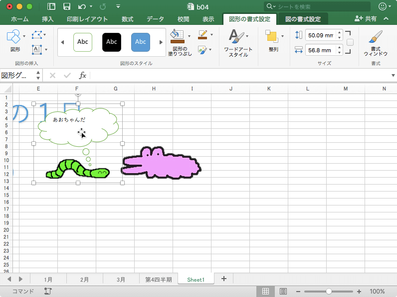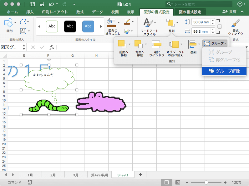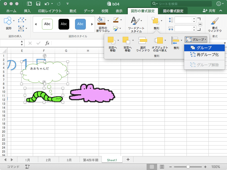 複数のオブジェクトをグループ化することで、まとめて移動ができたり、書式設定ができたりします。Excel 2016 for Macで対象となる図または図形を選択して、[図の書式設定]または[図形の書式設定]タブを開き、[整列]グループの[グループ]をクリックして、[グループ]をクリックします。