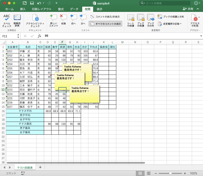 Excel 2016 for Macでワークシート内のすべてのセルのコメントを表示するには、[校閲]タブを開き、[すべてのコメントの表示]をクリックします。