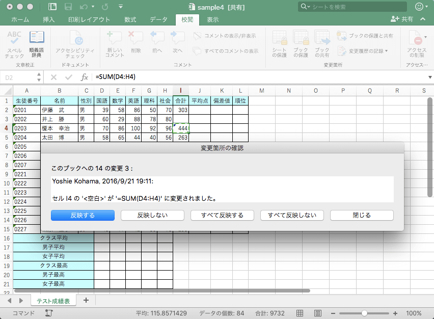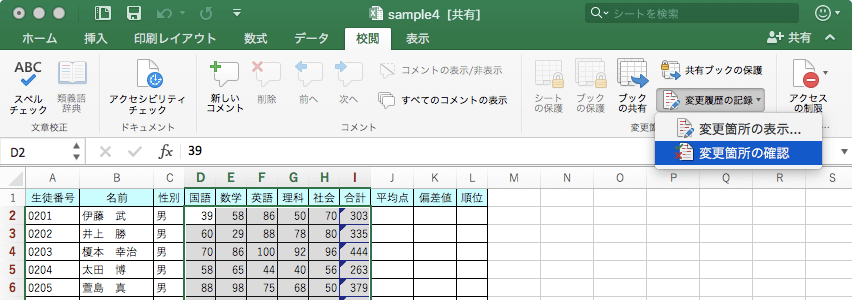 変更履歴を記録している間にブックに加えた変更は、変更前の内容と変更後の内容の両方が記録されます。[変更箇所の確認]を使うと、変更箇所をひとつずつ確認しながら、変更後の内容をブックに反映するか、変更後の内容は反映せずに元に戻すかを選択できます。