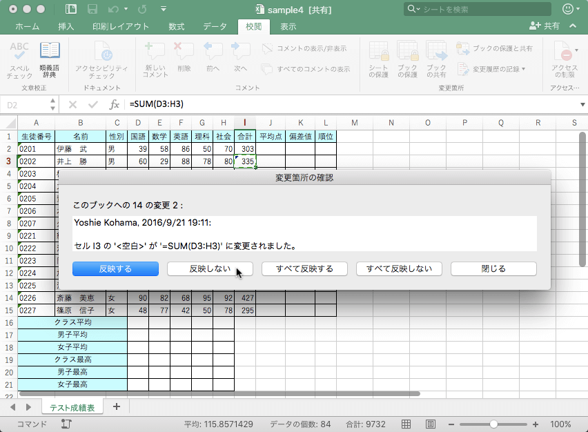 Excel 2016 for Macで[校閲]タブを開き、[変更]グループの[変更履歴の記録]から[変更箇所の確認]をクリックして、[反映する変更の選択]ダイアログボックスで[OK]ボタンをクリックすると、ひとつずつ確認しながら変更後の内容をブックに反映するか否かを選択できます。