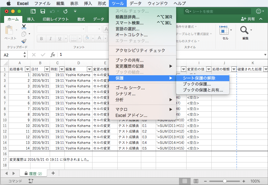 変更箇所一覧が作成された[履歴]ワークシートは保護された状態でロックされ、ブックの共有を解除すると、履歴ワークシートが削除されます。Excel 2016 for Macでこの履歴を保持したい場合は、その一時的に生成された[履歴]ワークシートを新しいブックにコピーして、ワークシートの保護を解除するとOKです。