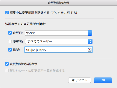 Excel 2016 for Macで[校閲]タブの[変更]グループの[変更箇所の表示]を選択したときに表示されるダイアログボックスにて、指定した期間、指定したユーザー、または指定した場所(セル範囲)に対して変更した内容を確認できます。