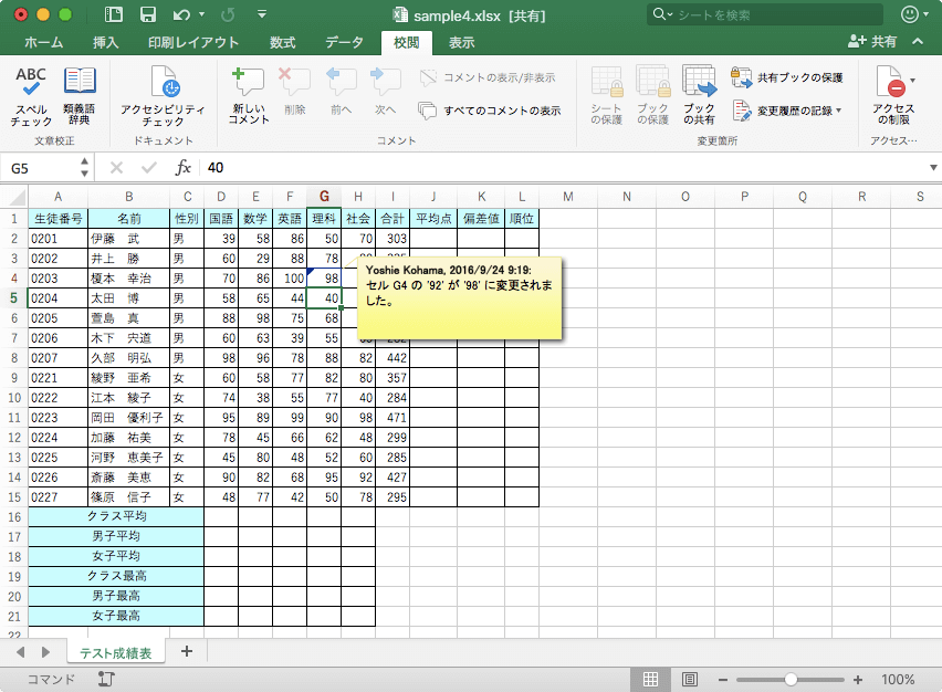 - タイトルバーに[共有]と表示されたら、指定セル範囲外に変更を加えても強調表示されないことを確認します。