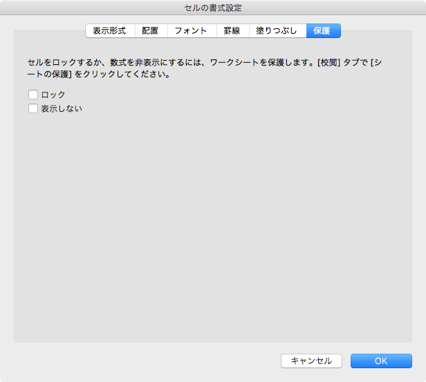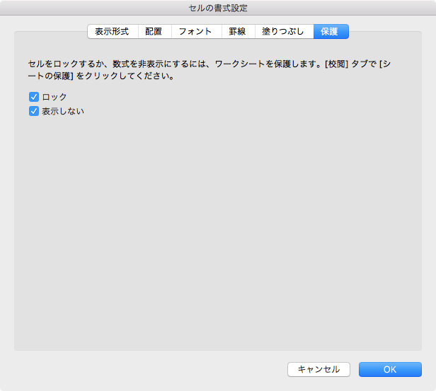 - [セルの書式設定]ダイアログボックスの[保護]タブを開きます。