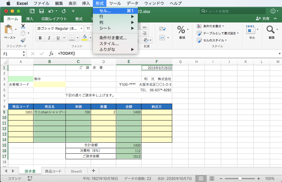 - 編集の可能性のあるセル範囲を右クリックしてショートカットメニューより[セルの書式設定]を選択するか、Commandキーを押しながら1を押します。